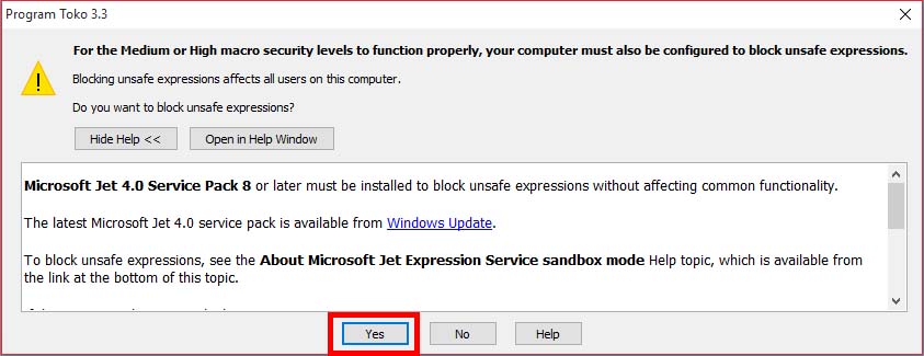 Saat Pertama kali membuka program Toko iPos 3.3 dan Bengkel 2.0 Program akan menampilkan Security Warning dari Office seperti berikut :Klik Tombol YES, kemudian akan tampil kembeli informasi berikut :