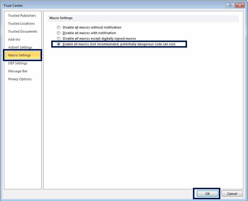 Setelah itu Setting Macro pada Office 2007 untuk Program Toko 3.X dan Bengkel 2.0. Macro perlu disetting agar tiap membuka program tidak menampilkan informasi blokir.